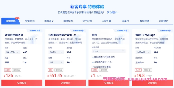 百度智能云新客专享优惠 年度好价限量抢购!百度智能云轻量应用服务器126元/年起。