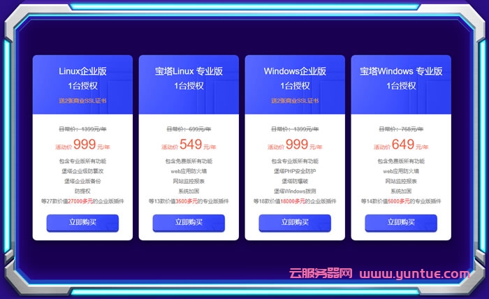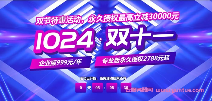 宝塔面板 推出1024·双十一特惠活动,企业版活动价低至549元/年,还赠送SSL证书 ,专业版永久授权2788元起,最高立减30000元,优惠力度很大,活动时间有限,快来抢购吧!