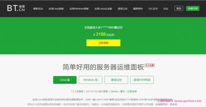 宝塔新用户的福利,可以领取3188元代金券了,数量有限,先到先得。立即领取