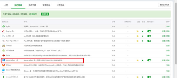 首先,安装Memcached,宝塔后台 – 软件管理 – 运行环境 – 安装Memcached,需要一段时间来安装(注意:安装Memcached需要把服务器重新启动一下才能安装,在启动后进入面板就会看到安装已经启动了,安装过程大概10分钟,你可以泡杯咖啡喝。):