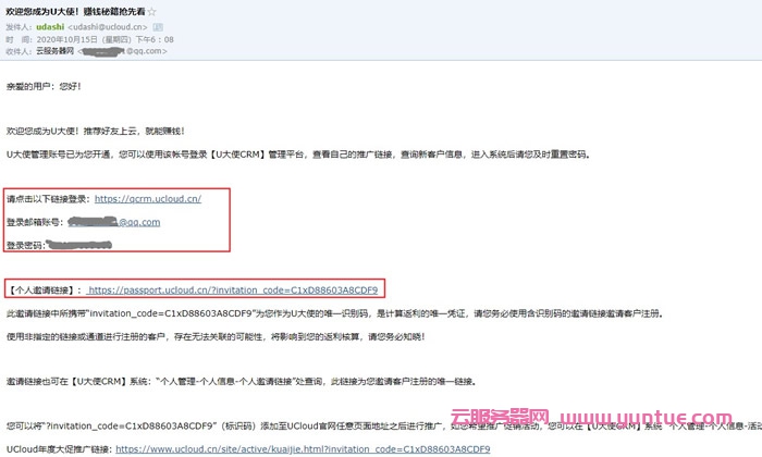 2、开通U大使CPS推荐系统账户时,UCloud账号注册邮箱将收到UCloud优刻得U大使CPS推荐系统账户和密码,以及新的个人推荐链接。所以一定要确保我们的注册邮箱是还在使用的,另外UCloud工作人员告诉我,带ytag的上一版推荐链接会在2020年6月30日24点后失效(即这个时间之前,老的推荐链接也是有效的,老推荐链接和系统新推荐链接同时计入返佣)。