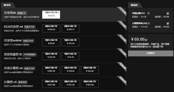 | ECS共享型S6 | 1核/2G/40G高效云盘 | 1M宽带 | 秒杀价:69.86/年起 | 【2000元代金券】 【活动直达】 |