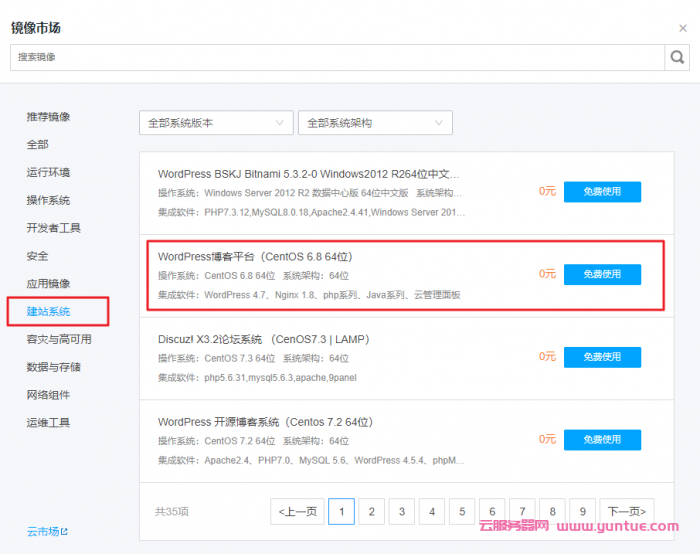 在弹出的【镜像市场】对话框中,选择【建站系统】> 【WordPress博客平台】,单击【免费使用】。如下图所示: