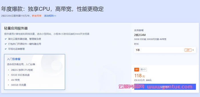 年度爆款:独享CPU,高带宽,性能更稳定,2核2G4M云服务器118元/年,新老同享