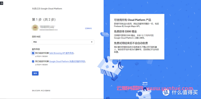 谷歌搜索gcp就可以进入谷歌云的界面,右上角点击免费试用进入注册界面,国家/地区我选的是美国,因为现在已经没有中国大陆的选项了,但可以选择香港、台湾地区,这里按需选择吧。把下面两个勾打上直接下一步。