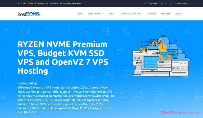 本次hostEONS送上的是针对AMD Ryzen和Intel E5处理器云服务器,限时大约1周的时间(或者库存售罄)购买洛杉矶、纽约机房云服务器可免费升级10Gbps带宽端口!活动不能直接提交工单获得,必须在LowEndSpirit主机论坛回复帖子获得带宽端口升级。