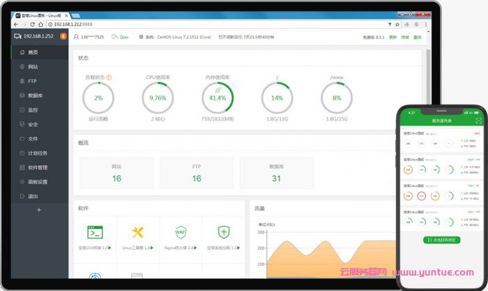 宝塔Linux面板是提升运维效率的服务器管理软件,支持一键LAMP/LNMP/集群/监控/网站/FTP/数