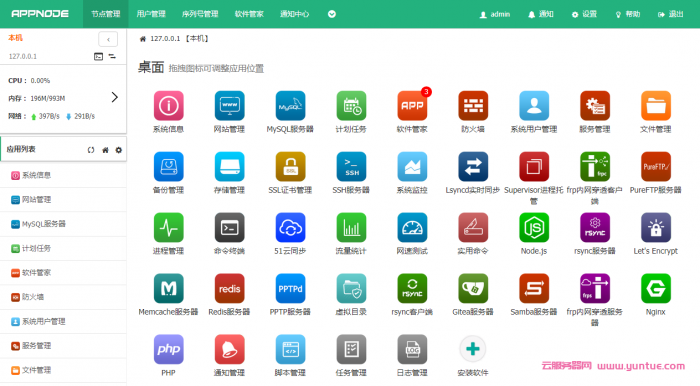 (1)集中式设计,快速切换管理:安装一个控制中心即可管理你的所有服务器,其它服务器只需要安装受控端。再也不用分别登录到每台服务器去管理了。(2)强大的网站管理功能:通过整合 Nginx、PHP、MySQL 等组件,帮助您快速创建和配置网站。(3)快速安装升级,丰富的软件市场:仅需执行一条命令即可全自动安装,安装耗时不到 1 分钟。版本升级无需重装,一键点击即可在线升级。丰富的软件市场,满足您多样化的服务器软件需求,您的服务器不再仅仅是 Web 服务器。(4)多重安全加固,资源实时监控:从操作系统层面和应用层面,提供多项加固措施保障您的服务器和应用安全。强大的系统监控功能,让您对服务器的资源消耗情况了如执掌。(5)全面开放的 API:全面开放的 API 机制,便于您将 AppNode 已有的功能整合到您的系统中。