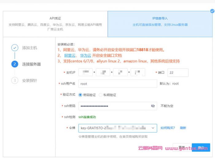 支持IP凭证导入和IP直接导入,API凭证支持阿里云、腾讯云、百度云、华为云、京东云、网易云能API调用厂商云主机,因为手上只有普通云服务器机器,所以就只用ip导入了。看图: