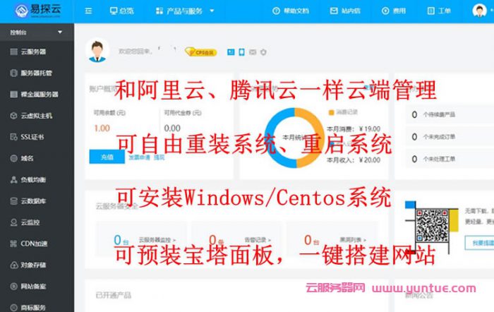 后台界面:和阿里云、腾讯云主流云品牌一样云端后台管理,可自由重装系统、自由重启系统,可安装windows、Centos系统等,可预装宝塔面板,一键搭建网站!