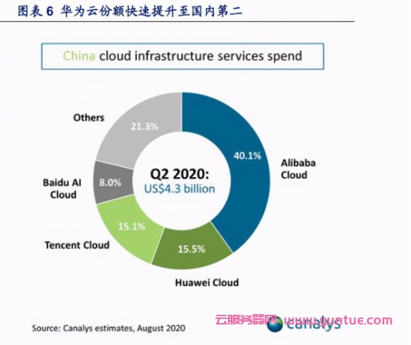 虽然华为年报中没有披露云业务的具体收入数据,不过,根据Canalys报告数据,2020年华为在中国公有云市场排名第二;在全球IaaS市场,排名上升至第六,增速达222.2%。