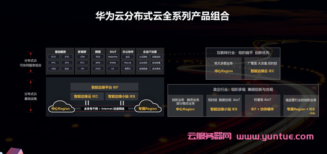 华为云打造云基础设施新范式分布式云产品组合由分布式云基础设施、可与之进行充分协同的云服务组合两部分组成,广泛应用于互联网企业和中大型政企。分布式云基础设施方面,主要包括中心Region、专属Region、部署于城域热点区域的智能边缘云IEC、部署于企业机房的智能边缘小站IES,以及支持广泛边缘设备的智能边缘平台IEF。可与分布式云基础设施充分协同的云服务组合主要包括基础服务、音视频、数据、AIoT、办公协同等服务,以及统一的企业IT治理框架。