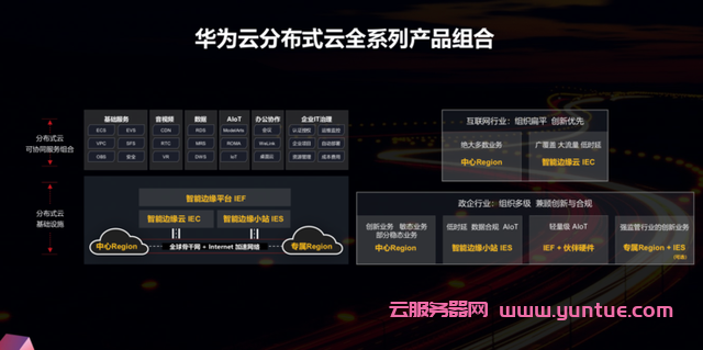 对于强合规监管行业的业务创新场景,比如金融交易分析、创新药研发、能源互联网等,华为云今年内将发布业界独有产品组合:专属Region加IES的方案,为客户提供全栈专属的分布式云。