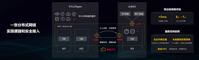 应用可以在一个地点部署后,实现任意位置的内网访问,提供无差别的使用体验。如数据库需要更好的时延,需要部署在本地,Web、APP需要更好的弹性,可以部署在中心Region,同时可以实现数据库以及Web、APP的安全互访,从而实现高效的协同。