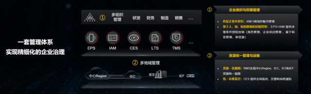 最后,对于分布式云的管理,华为云通过EPS、CBC、IAM 服务提供了5级组织账号管理,可以让企业实现基于人、物、财的精细化权限管理,来匹配企业多层级、多部门、多流程的组织模型和管理诉求。同时通过RMS的资源统一视图,和CES的运维监控视图,实现了中心Region、IEC、IES和IEF 的统一管理和运维监控,避免了精细化上云带来的繁重的运维和监控工作。