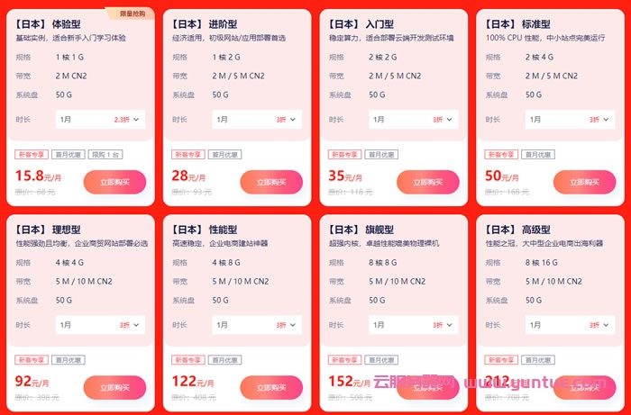 | 日本云 | 2核2G | 50G(SSD) | 2M/5M(CN2) | 35元/月 | 283元/年(原价1416元) | |