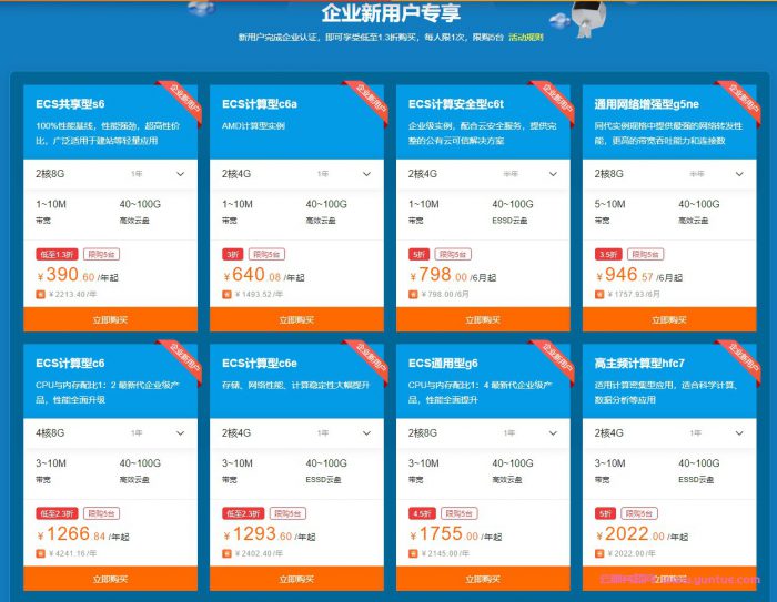 如上图所示,阿里云企业新用户专享活动中的企业级云服务器,机型有共享型s6、计算型c6、c6e和c6a、通用型g6、计算安全型c6t、通用网络增强型g5ne、高主频计算型hfc7、高主频通用型hfg6、通用平衡增强型g6e,带宽可选1~10M,购买时长可选1年/3年,购买时长越长就越优惠,而且价格跟所选的机型、带宽和时长有关,这里就不一一列举,仅列出每个规则最低配的1年和3年供参考,更具体的价格建议前往阿里云服务器精选特惠活动中的“云服务器ECS > 企业新用户专享”了解选购。