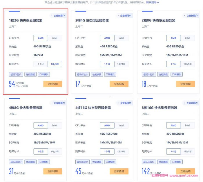 下图是全球购优惠活动相应的套餐,点击“立即抢购”按钮就可以进行抢购了,1核2G云服务器企业用户购买仅94元/年,有一个月4元的体验机型,建议直接购买一年以上更好,非常的不错。