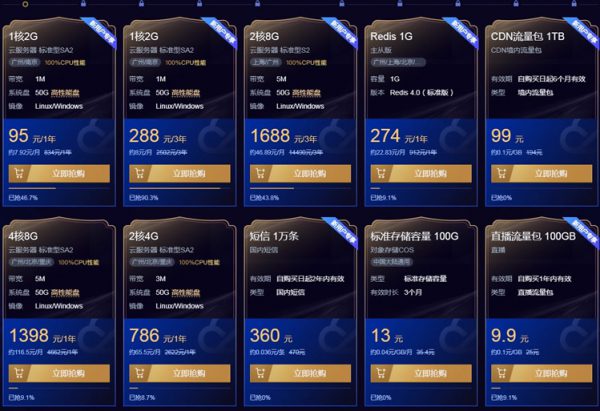 你可以参加每日5场的秒杀活动,云服务器1核2G首年95元,MySQL基础版1核1G首年56元。这个价格可以说是非常低了。个人亲测,这些爆款云产品真的很快就被抢完了,所以还需留点心。
