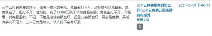 三丰云打着免费的牌子,做着不是人的事儿,免备案打不开,还标榜可以免备案,是免备案了,但打不开,他妈的,花了18999元买了个终身服务器,免备案打不开,不能用,找客服退款,不退,不管是电话客服也好,还是qq客服也好,买前是他爹,买后有事儿不理人,三丰云就是坑人,坑人的不会有好报