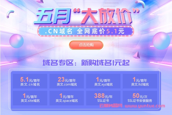 本次五月活动力度最大的为cn域名,只需要5.1元,比较划算。还有很多1元域名出售,比如:英文.xyz域名、英文.ltd域名、英文.site域名、英文.space域名、英文.fun域名、英文.online域名。