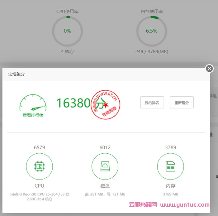 以下配置为 E5-2640v3 4H4G3M的跑分,CPU层面在多核心CPU里面算是优秀了【主频较高】,磁盘读写速度也较为优秀。
