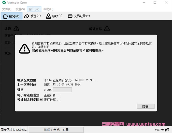 3.点击OK之后,就是一个比较漫长的安装等待过程了(真的很久,会长期停留在安装界面毫无动静,而且记得关闭杀毒软件,不然会各种拦截),安装完成后,就会开始漫长的区块同步,大概有5G。
