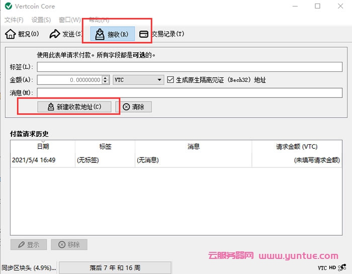 4.不过同步区块的时候,我们就已经可以创建收款地址了,先点击隐藏区块的同步进度,然后点击“接收”,点击“新建收款地址”,就可以直接看见你的收款二维码和收款地址。
