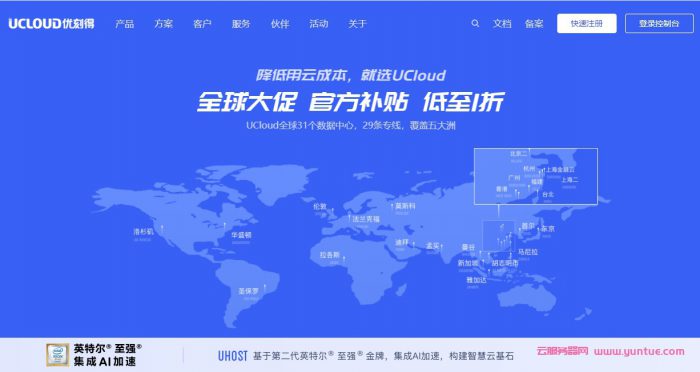 ucloud日本云服务器怎么样?ucloud优刻得是一家国内云服务器主机商,也是国内最早上市的云计算公司。目前,UCloud在日本、韩国、香港、台湾、欧美等地都有很多的数据中心。最近,UCloud持续全球大促优惠活动,针对国内云服务器给出了最低至4元/月的体验价,相当于4元就可以免费试用一个月ucloud云服务器了,全场低至1折起。今天,云服务器网(yuntue.com)小编主要介绍一下UCloud日本云服务器的优惠活动,1核1G云服务器低至133元/年起!