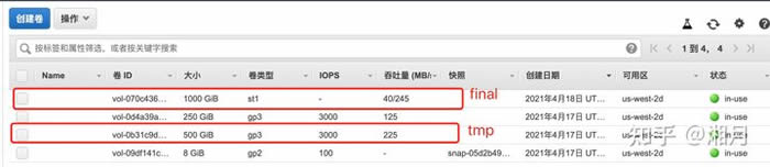 磁盘的话,gp3是SSD,做临时文件盘,st1便宜,做最终存Plot文件的盘。AWS的EBS有个比较强大的地方,就是可以单独给磁盘配置IOPS和吞吐。比如我500GB的SSD,默认IOPS 3000,吞吐125MB,运行两个任务时,吞吐先到达瓶颈,这时候你可以动态提升吞吐值(当然也会有额外的费用)