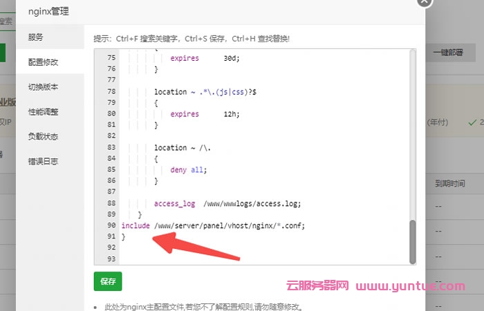 另外,您也可以切换到“配置修改”选项卡,修改当前的Nginx的配置文件,如果需要使当前配置生效,请在Web服务中重载配置文件。