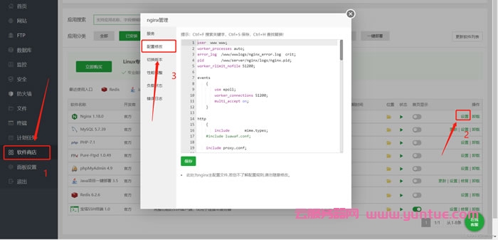 宝塔面板成功安装好Nginx后,您可在左侧菜单栏选择“软件管理”,然后找到Nginx,并点击“设置”链接,进入Nginx管理界面。