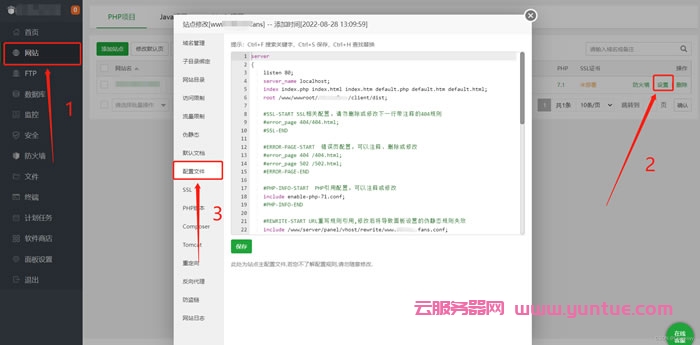 1,其中nginx配置中最后一行“include /www/server/panel/vhost/nginx/*.conf;”,配置文件就是项目配置文件,所以在nginx配置中A和B两部分(上面代码中已经标注)任选其一即可,不过我更推荐选择B,因为这样可以不用修改nginx配置,修改nginx配置后容易引来不必要的错误。