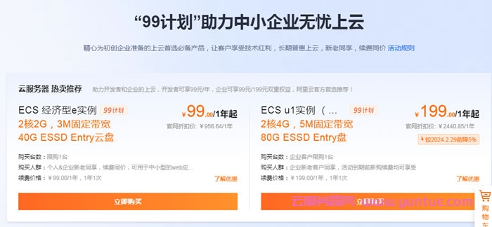 阿里云99元服务器新老用户均可购买,并且续费不涨价,续费依旧是99元一年,配置为ECS经济型e实例99计划、2核2G,3M固定带宽、40G ESSD Entry云盘;阿里云199元服务器企业用户均可购买,配置为ECS u1实例99计划、2核4G,5M固定带宽、80G ESSD Entry盘。更多云服务器配置和价格表如下: