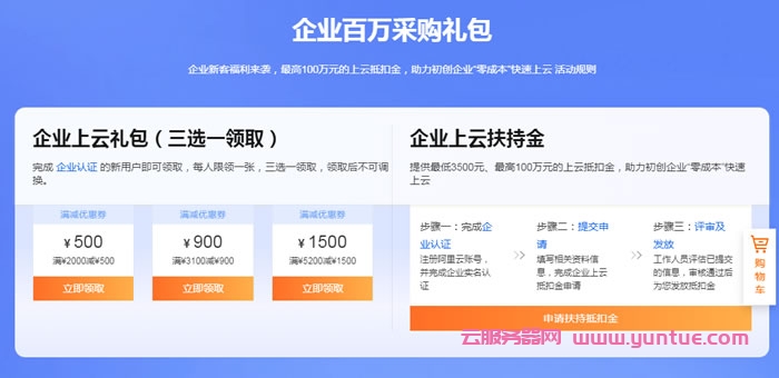·企业上云礼包优惠券:完成 企业认证 的新用户即可领取,每人限领一张,三选一领取,领取后不可调换,500元优惠券、900元优惠券和1500元优惠券;