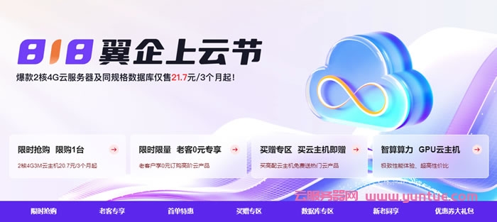 天翼云“818翼企上云节”活动开始了!目前,天翼云2核4G国内云服务器仅21.7元/3个月起,性价比不错!同时还推出限时限量0元购,对象存储及云硬盘备份等服务,可提供0元/首月起。抓紧时间,数量有限,先到先得!天翼云818活动,如何薅天翼云这波羊毛,快来进入活动了解一下吧!