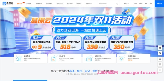易探云2024年双11活动开始了!易探云香港、美国云服务器9元/首月起,199元/年,香港物理服务器350元/首月起!其中香港云服务器为E5系列CPU,DDR4内存,此外2核4G 香港云VPS服务器5M带宽,518元/年,2核4G 美国云VPS服务器10M带宽,518元/年。国内800G高防御物理服务器仅350元/月起,续费同价。感兴趣的小伙伴可以围观。