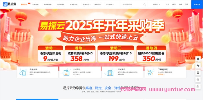 易探云2025开年采购季活动,香港、美国云服务器年付优惠,如:香港、美国云服务器1核/1G内存10M仅199元…