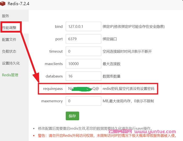 $_config[‘memory’][‘redis’][‘requirepass’] = ‘redis密码’;宝塔redis性能调整requirepass设置的这个密码
