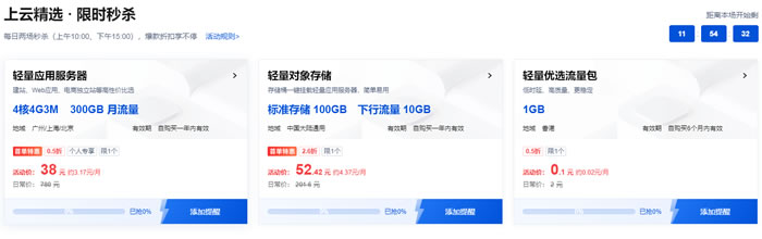 每日两场秒杀(上午10:00、下午15:00),爆款折扣享不停,轻量应用服务器4核4G3M 300GB月流量,仅38元/月起