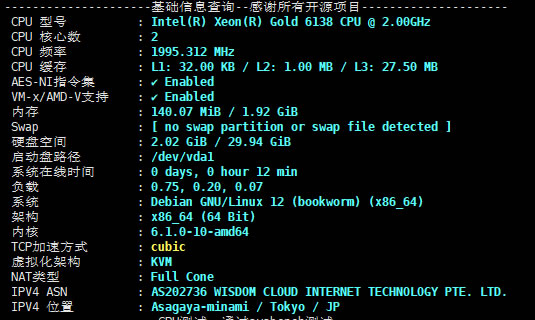 可以看到CPU使用的是 gold6138 基本频率为2.00GHz