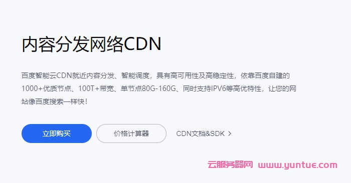 百度智能云CDN就近内容分发、智能调度,具有高可用性及高稳定性,依靠百度自建的1000+优质节点、100T+带宽、单节点80G-160G、同时支持IPV6等高优特性,让您的网站像百度搜索一样快!