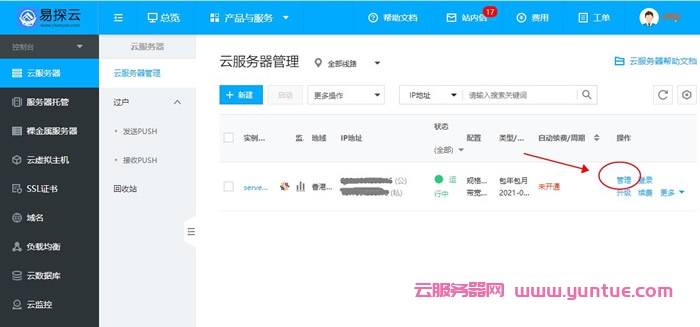 1、登录易探云官网-登录易探云账号-进入控制台-云服务器管理。