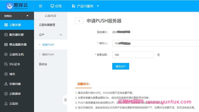 易探云服务器怎么过户/转让?易探云支持云服务器PUSH功能,该功能可将云服务器过户给指定用户。可带价PUSH,收到PUSH请求的用户在接收云服务器的同时,系统会扣除接收方的款项,同时扣除相关手续费,然后将款项打到发送方的账户下。易探云“PUSH服务器”的这一功能,可以让用户将闲置云服务器转让给更多需要购买的用户!