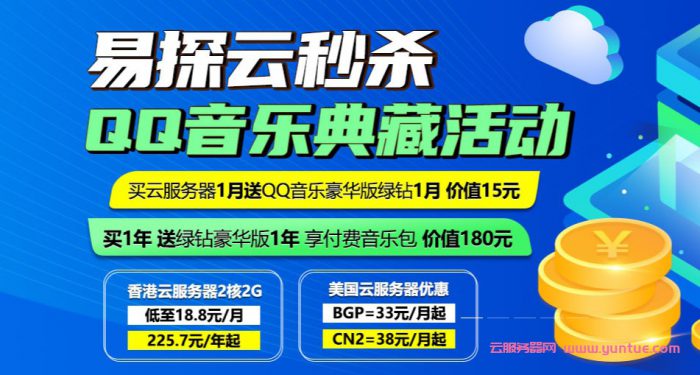 最后:易探云正在进行云服务器秒杀活动,买云服务器1个月送QQ音乐豪华版绿钻1月(价值 15 元);买1年送绿钻豪华版1年,享付费音乐包,价值180元起,香港云服务器2核2G低至18.8元/月,225.7元/年起!