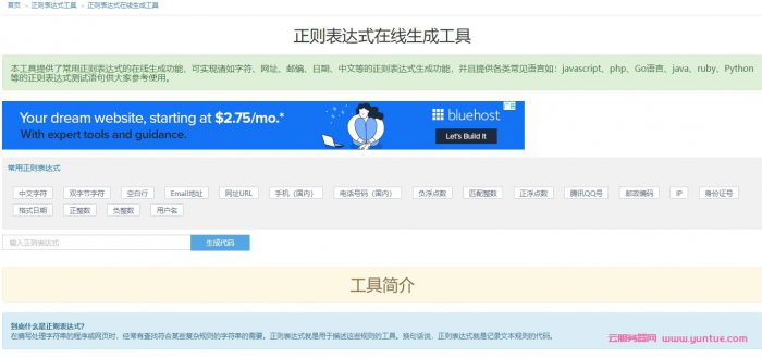 本工具提供了常用正则表达式的在线生成功能,可实现诸如字符、网址、邮编、日期、中文等的正则表达式生成功能,并且提供各类常见语言如:javascript、php、Go语言、java、ruby、Python等的正则表达式测试语句供大家参考使用。