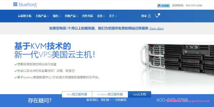 bluehost怎么样?bluehost推出新一代VPS美国云主机!前几天,BlueHost也推出了对应的周年庆活动,全场海外虚拟主机月付2.95美元起,年付送免费的域名和SSL证书,通过活动进入BlueHost中文官网,购买虚拟主机、云虚拟主机和独立服务器参与限时促销。今天,云服务器网(yuntue.com)小编给大家介绍的是新一代VPS美国云主机,美国SSD云主机,2核2G/20GB空间,独立ip,仅32元/月起!