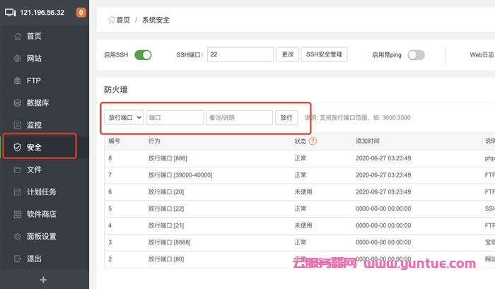 注意:用户宝塔面板放行端口可按需要放行,端口放行越少越安全,一般情况下我们可以关闭20、21等上传FTP端口!