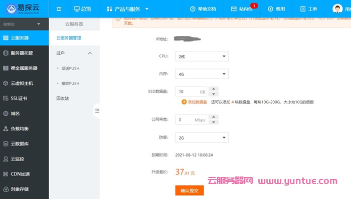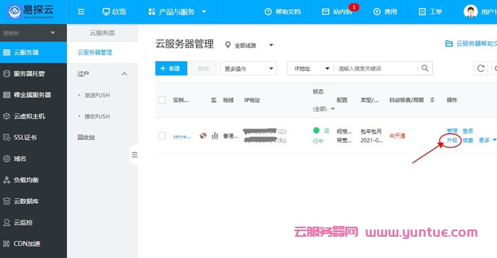 当用户的业务扩大,需要提升云服务器的硬件配置时,可以通过配置调整实现。对于所有云服务器,配置升级的生效时间均为即时生效。那么,易探云服务器的客户如何在后台自己升级配置呢?