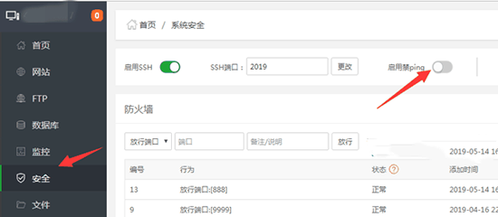 如上图所示,登录宝塔 Web 面板 >> 点击左侧“安全”菜单 >> 点击顶部“启用禁 ping”旁边按钮 >> 在弹出“是否禁 ping”警告框中点击【确定】按钮即可成功禁止服务器 ping。